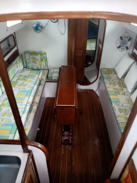 Veleiro oceânico clássico em fibra de vidro, projeto Leonard Joseph Savelkoul, 1982, estaleiro Marevela, área de navegação mar aberto, capacidade 5 pessoas.